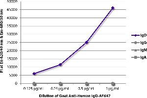 Reacts with the heavy chain of human IgD as demonstrated by ELISA and flow cytometry.