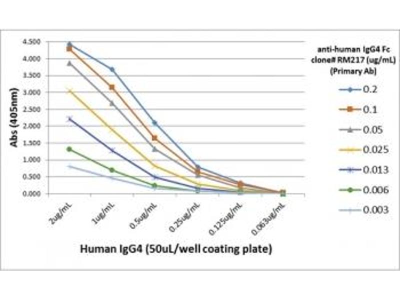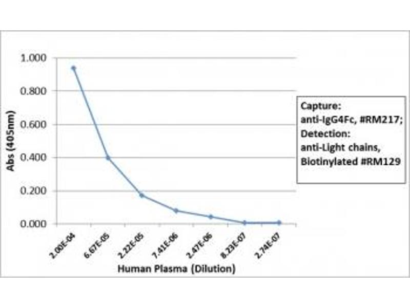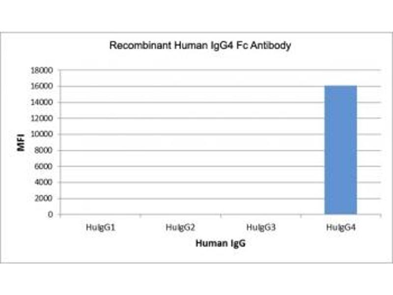 This recombinant Human IgG4 Fc antibody reacts to the Fc region of hIgG4. No cross reactivity with human IgG1, IgG2, IgG3, IgM, IgA, IgD, IgE, mouse/rat/goat IgG.