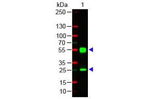 This product was prepared from monospecific antiserum by immunoaffinity chromatography using Mouse IgG coupled to agarose followed by conjugation to fluorochrome and extensive dialysis against the buffer stated above. Assay by immunoelectrophoresis resulted in a single precipitin arc against anti-Goat Serum, Mouse IgG and Mouse Serum. This antibody will react with heavy chains of Mouse IgG and with light chains of most Mouse immunoglobulins.