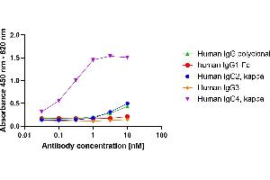 goat IgG. Other species were not tested. No cross reactivity with the other human IgG subtypes IgG1, IgG2 and IgG3