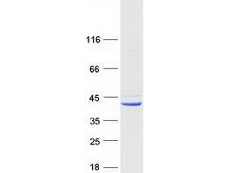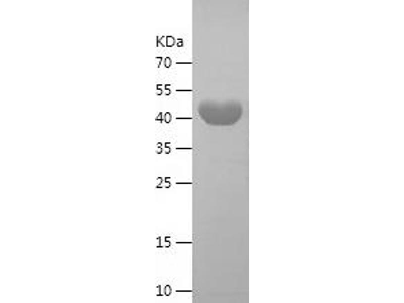 The purity of the protein is greater than 90 % as determined by SDS-PAGE and Coomassie blue staining.