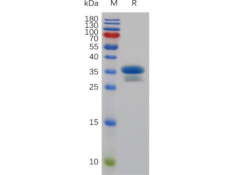 The purity of the protein is greater than 90 % as determined by SDS-PAGE and Coomassie blue staining.